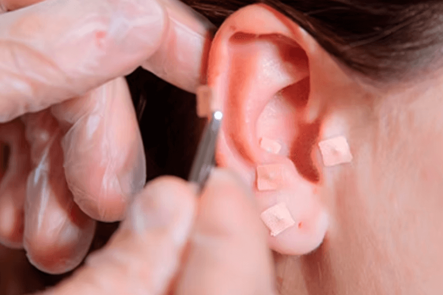Tratamento através de estimulação de pontos reflexos na orelha, tratando dores, ansiedade, distúrbios hormonais...